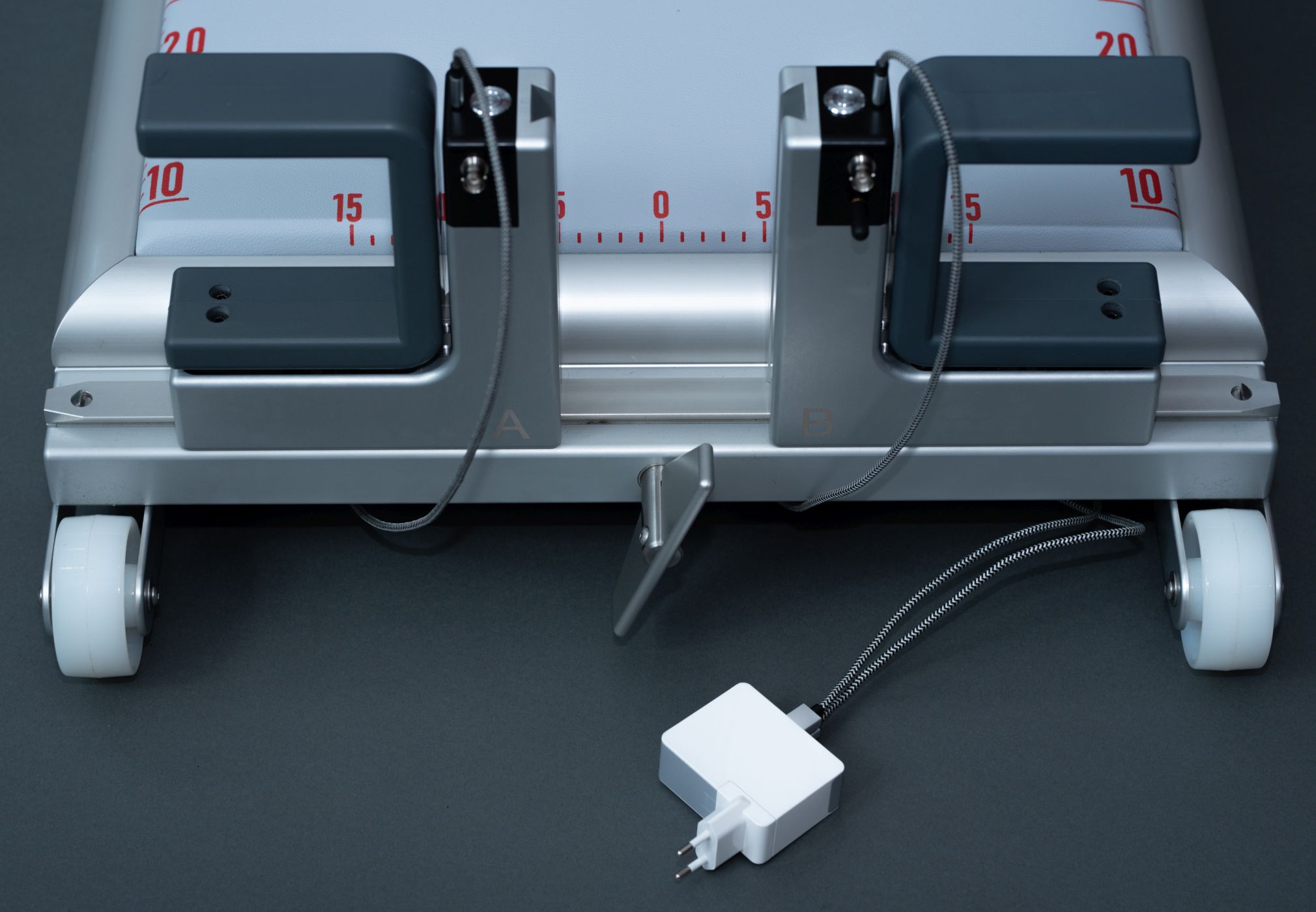 The main frame and two easily mounted and adjustable force sensors, with integrated wheels and a handle for easy moving of the MuscleBoard.